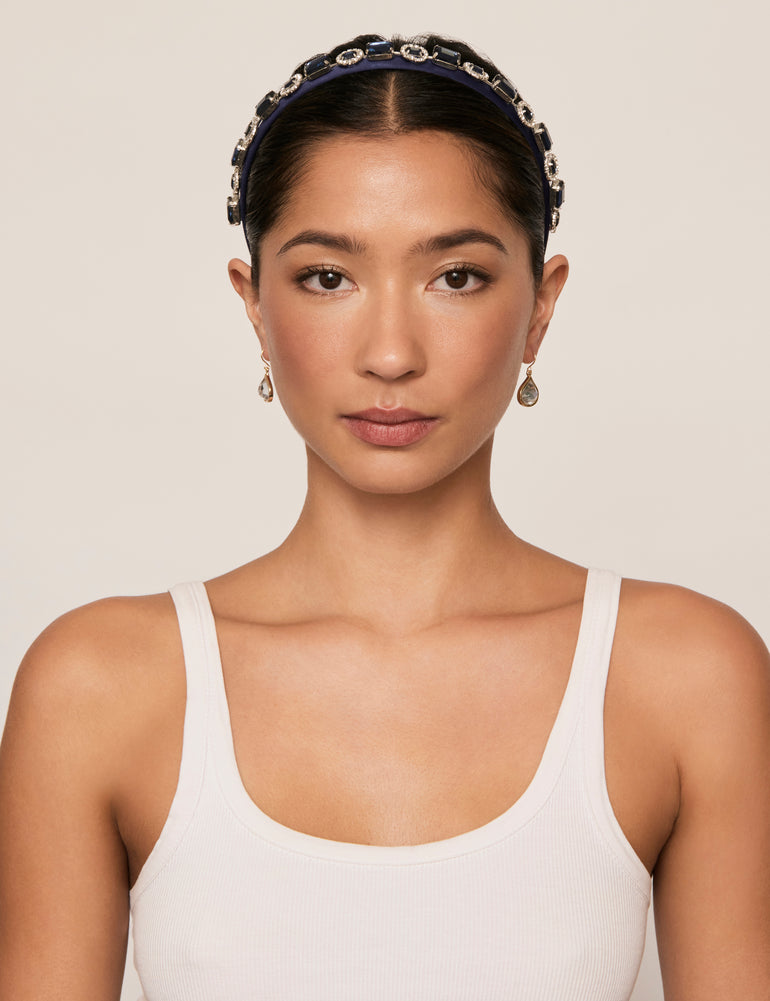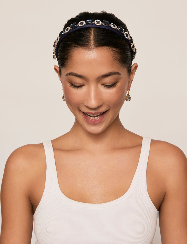 The slim and stylish Bejewelled Narrow Headband from Amelie is a beautiful choice to elevate your everyday style or complete outfits for special occasions. This elegant headband in rich navy blue features faceted blue stones and fine stone detailing for a stunning touch of sparkle.
