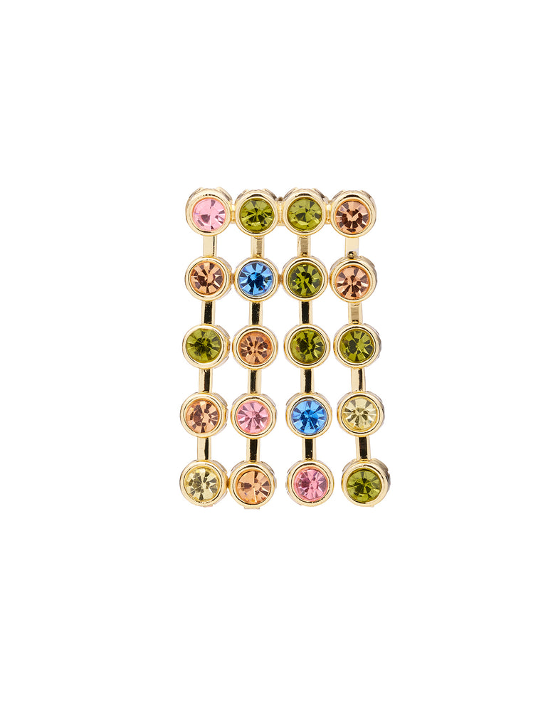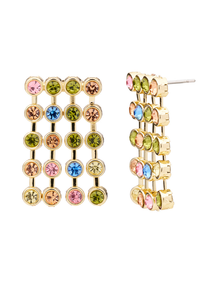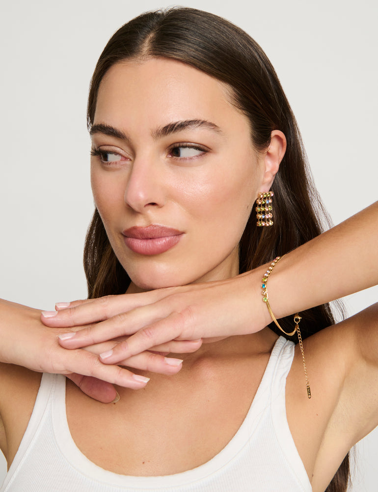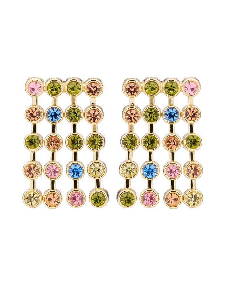 These earrings combine playfulness and sophistication. The colourful stones bring a joyful, eye-catching sparkle, while the geometric layout keeps the design polished and chic. Ideal for adding a pop of colour to both casual and dressy outfits.