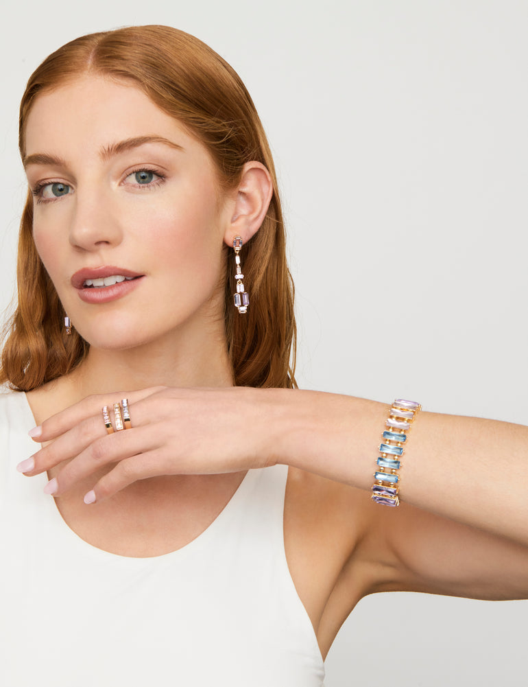 Perfect for day or evening elegance, the Medley Bracelet is a beautiful choice to pair with your favourite looks. This eye-catching stretch bracelet features brilliant gold-coloured plating and multi-coloured, faceted, rectangular stones, adding gorgeous colour and sparkle to every outfit.
