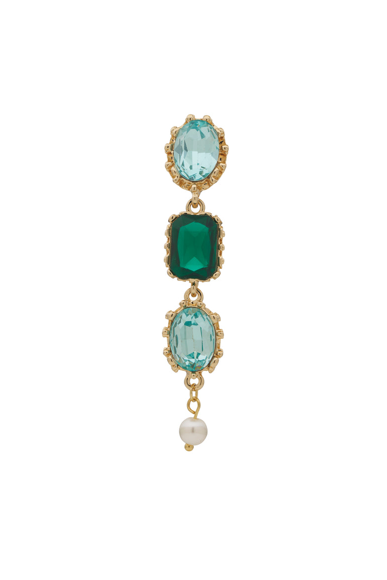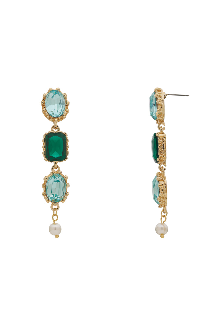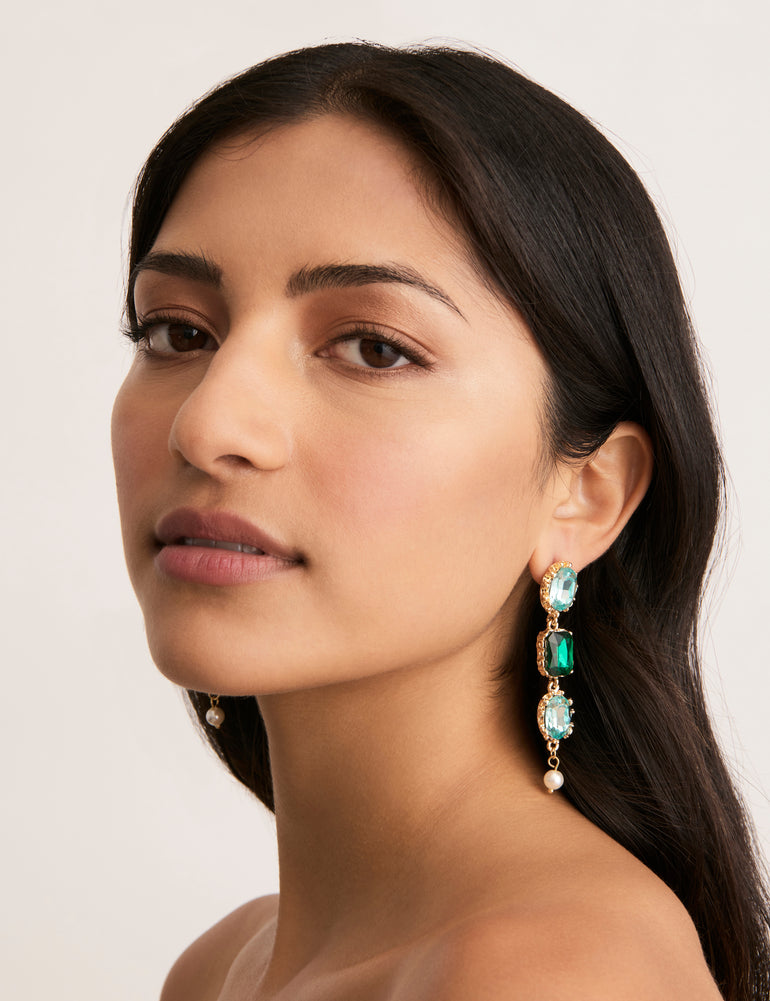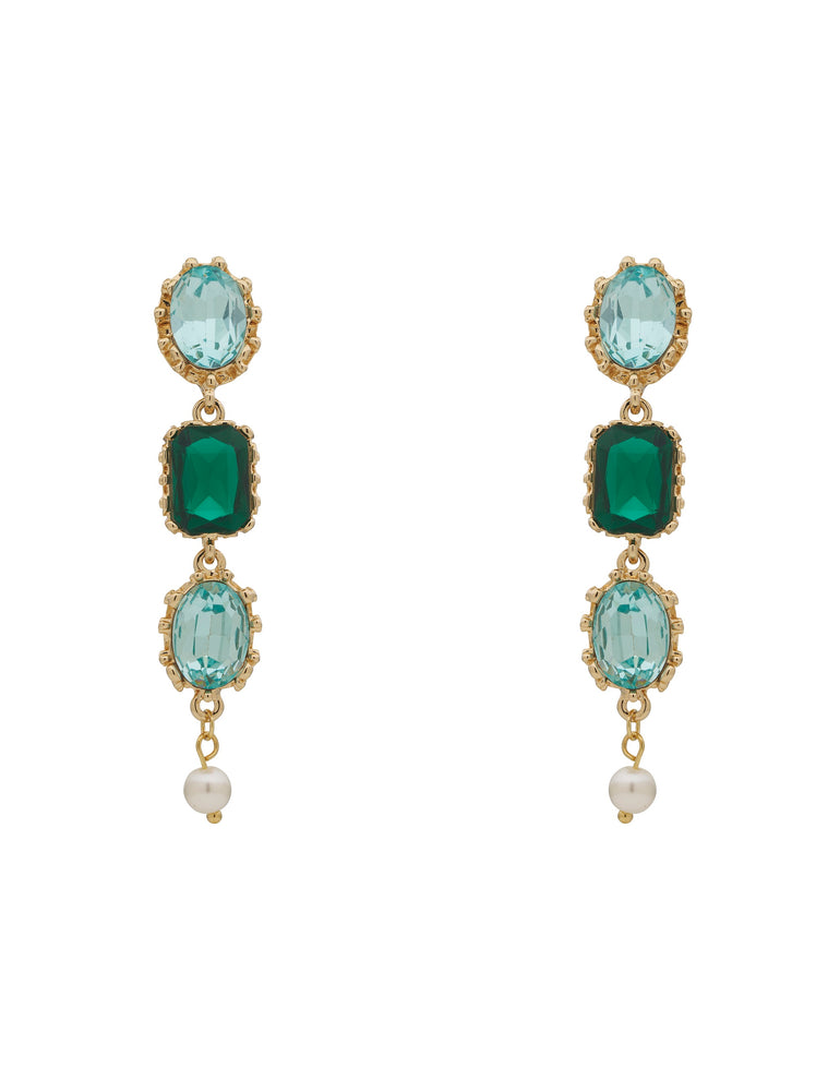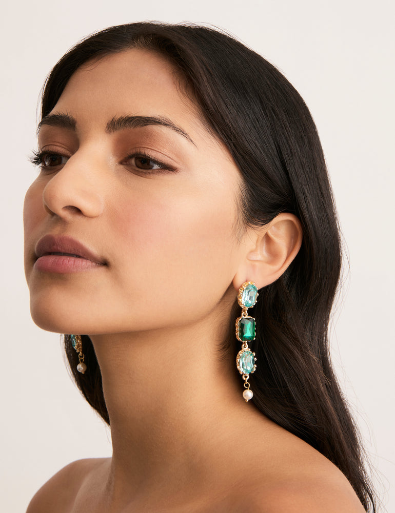 Dress up any outfit with a touch of gorgeous colour with the Pearl End Oval Stack Earrings from Amelie. Inspired by classic, old-world elegance, these beautiful earrings feature faceted oval and rectangular stones in eye-catching shades of green, with bright gold-coloured settings and fine faux pearl accents.