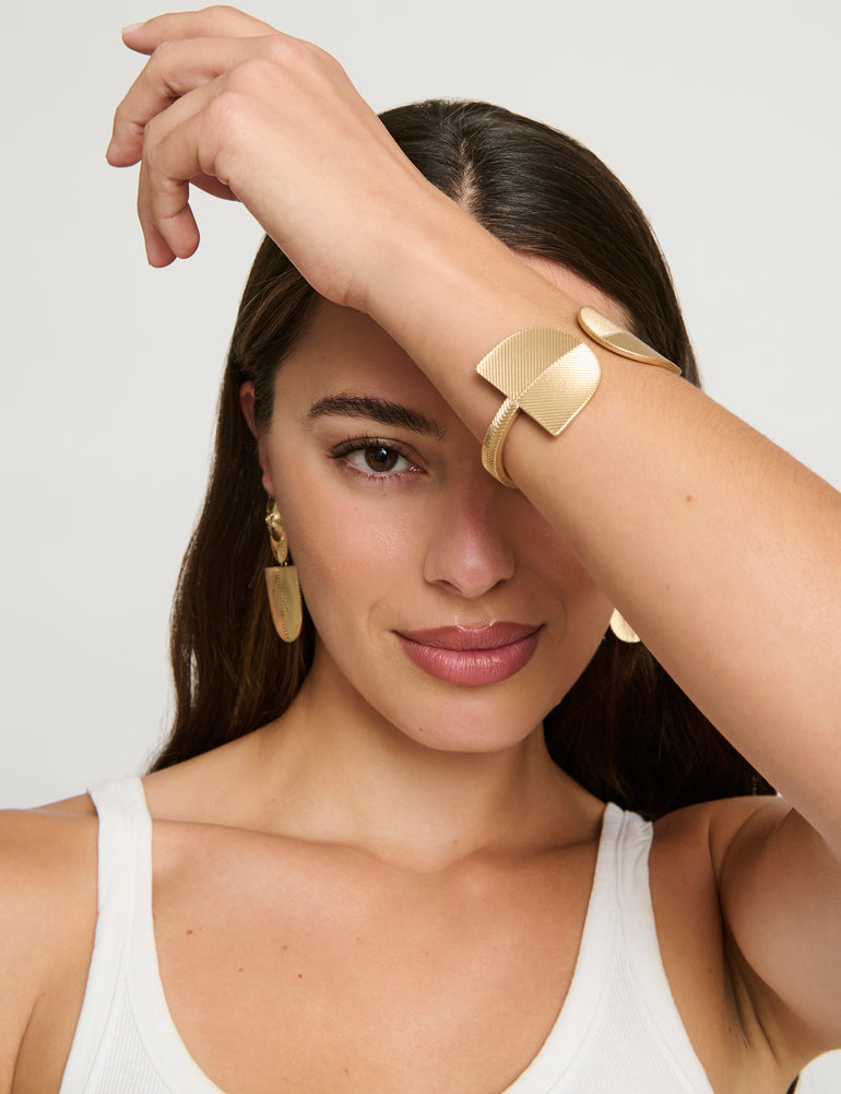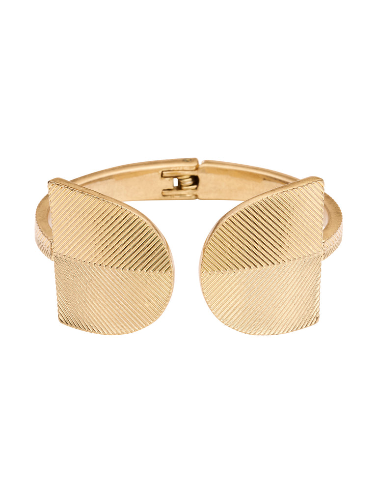 A minimalist yet distinctive open-cuff bracelet with an emphasis on modern craftsmanship. Adding to the look is the interesting shape and textured line work in the design that is enhanced by the matt gold-coloured plating.