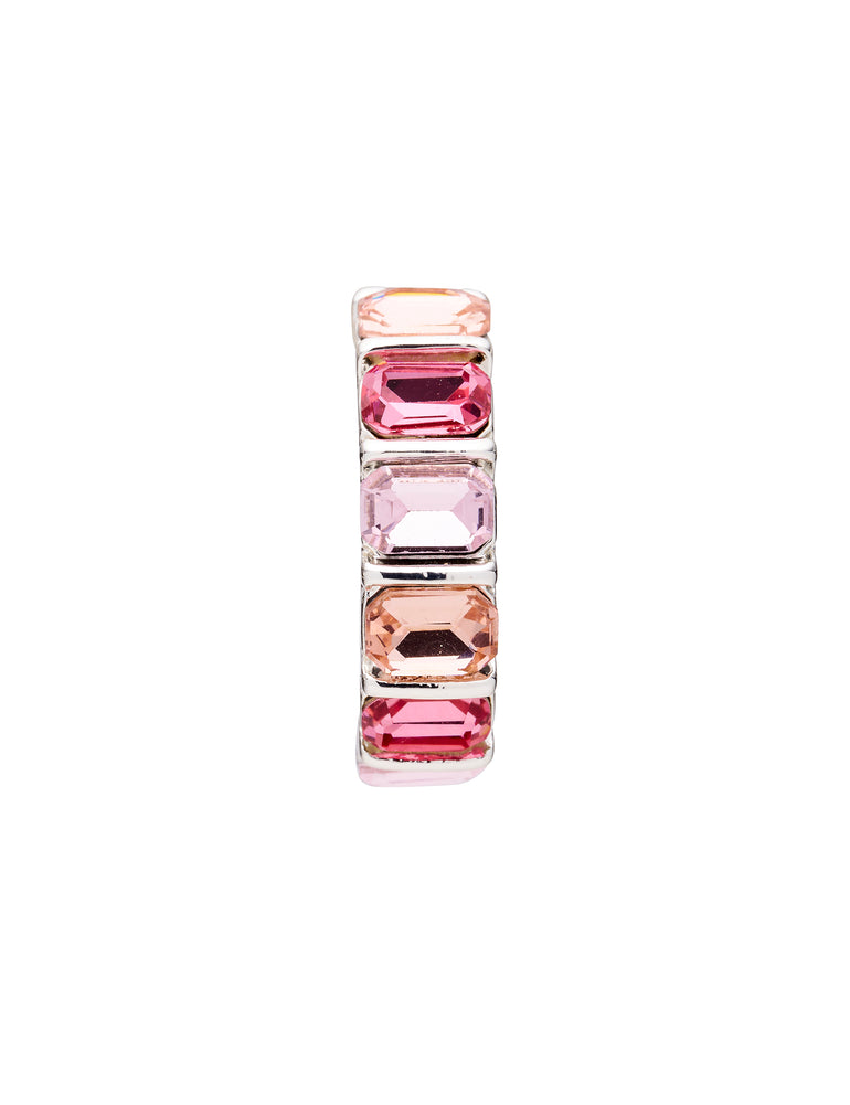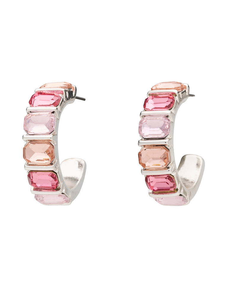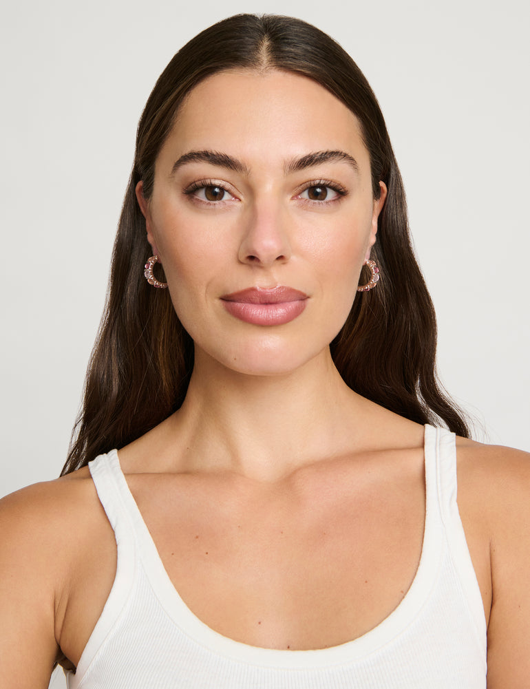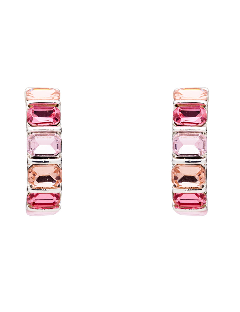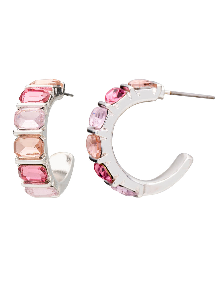 These earrings are small, half hoop style studs with a sleek, modern design. They feature baguette stones set in a row along the curve of the hoop. They offer a colorful yet elegant look that can complement both casual and dressy outfits.