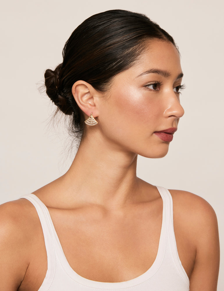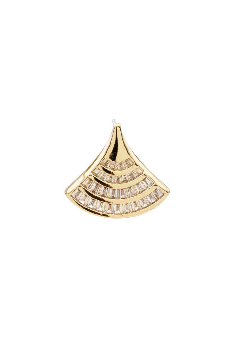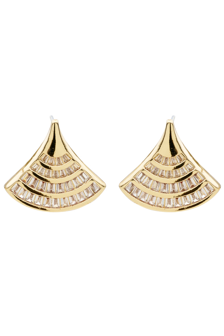 These earrings feature a refined fan-shaped silhouette highlighted by rows of sparkling baguette-cut CZ stones. The sculptural gold-coloured finish enhances the elegant tiered design, creating a modern yet timeless piece that brings subtle radiance to any look.