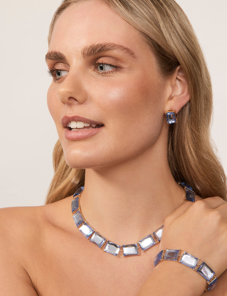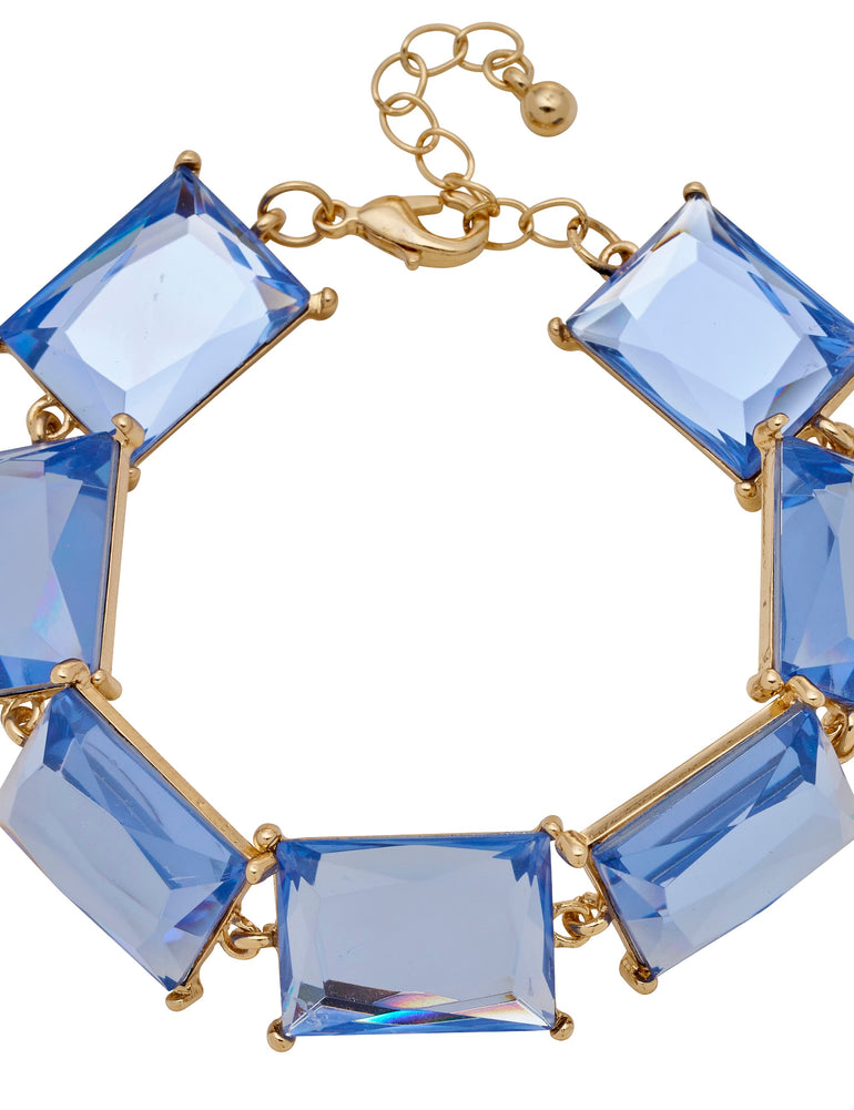 In beautiful light blue, the Interlude Stone Bracelet from Amelie brings stunning shine to your favourite looks. This eye-catching bracelet features faceted rectangular stones in pale blue, set in bright gold-coloured plating, perfectly balancing elegant style with gorgeous colour. To complete your look, pair it with the Matinee Stone Necklace, available separately.