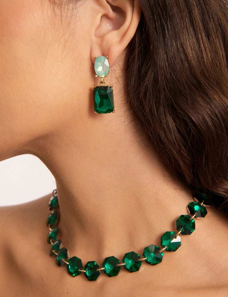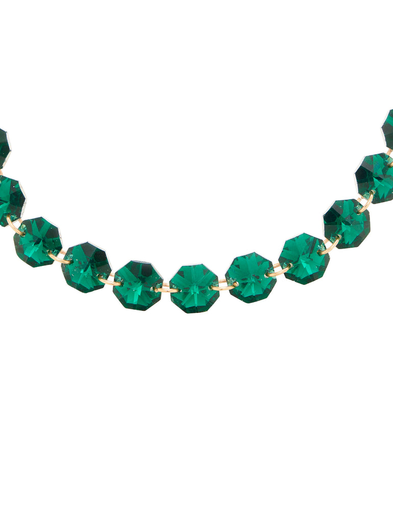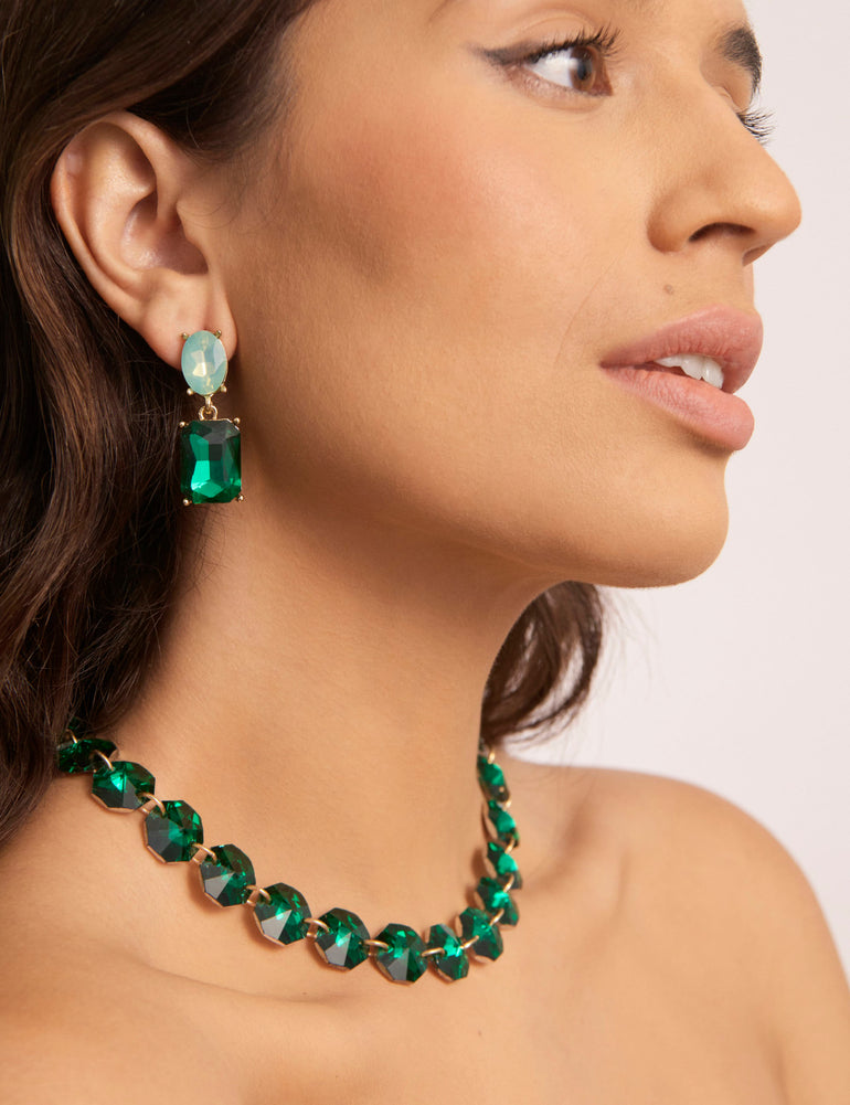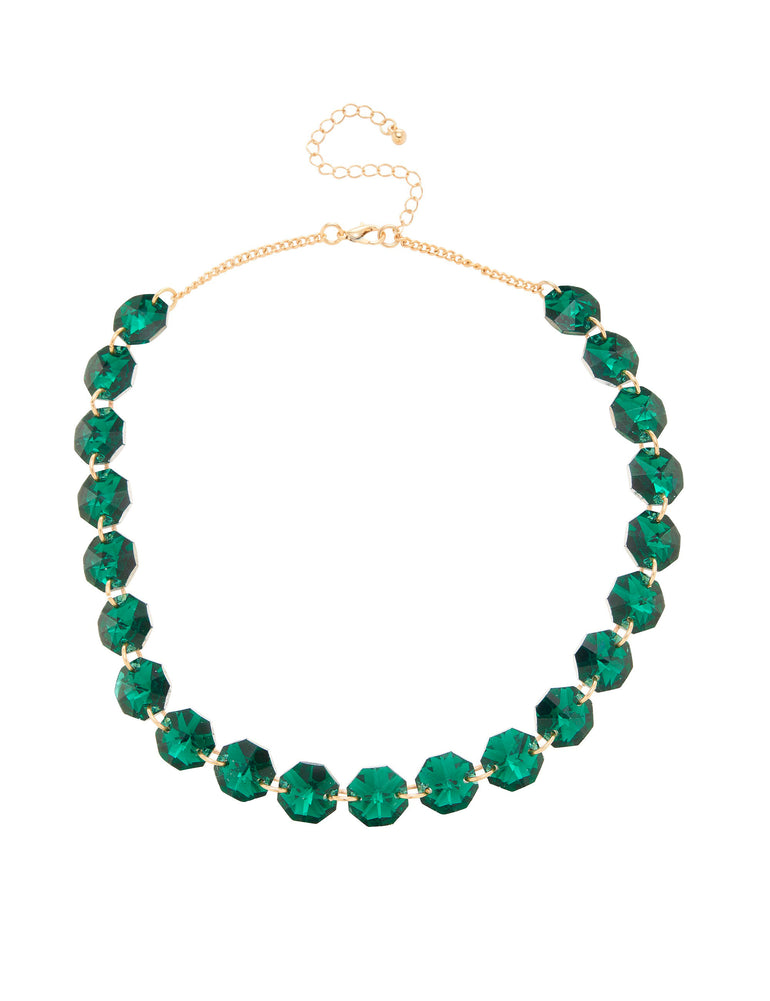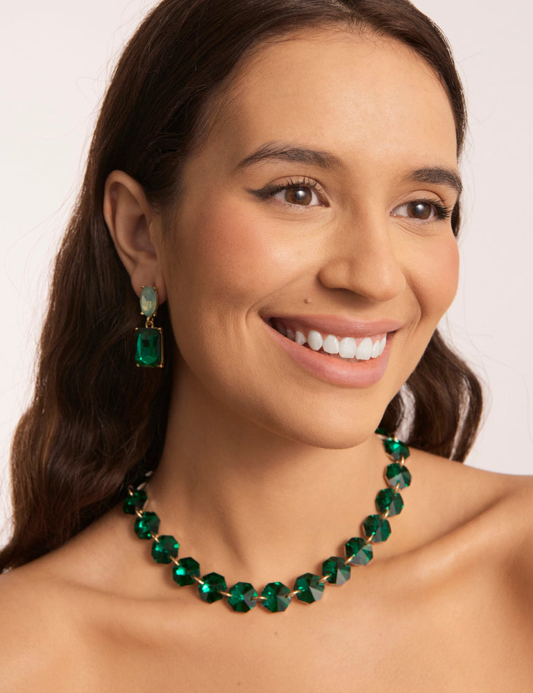 This dramatic crystal stone necklace features eye-catching, oversized faceted stones to add a statement finish to any outfit. With large glass stones in vibrant green, the Olympia Stone Necklace captures bold yet elegant colour and a gorgeous touch of sparkle that’s sure to turn your admirers green with envy with