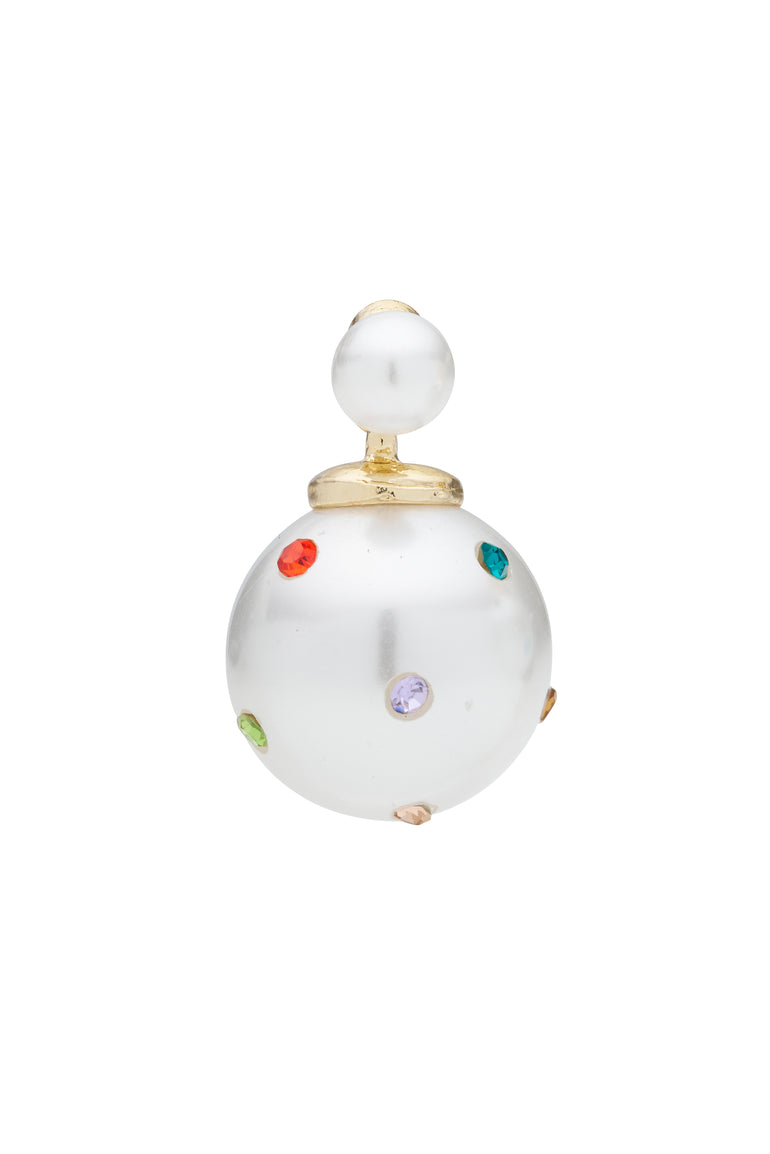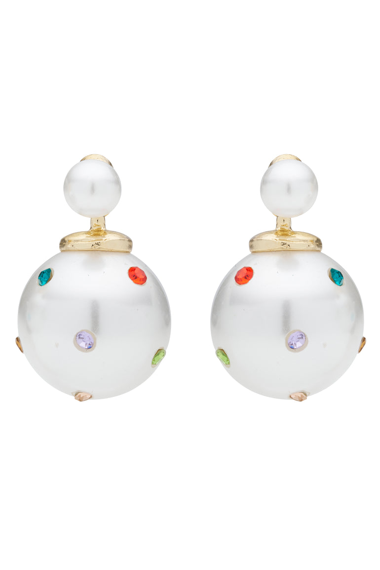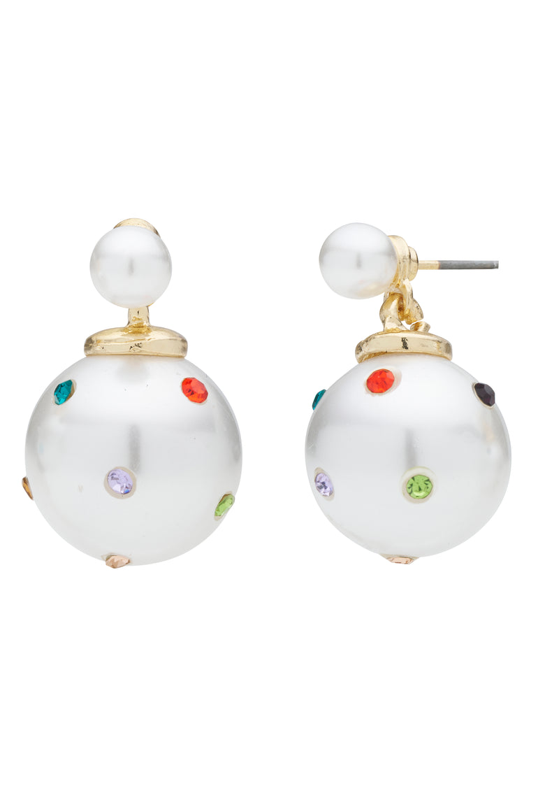 Blending elegance with playful charm, these earrings feature a small pearl stud with a larger drop pearl, accented by colourful rhinestones in various shades.