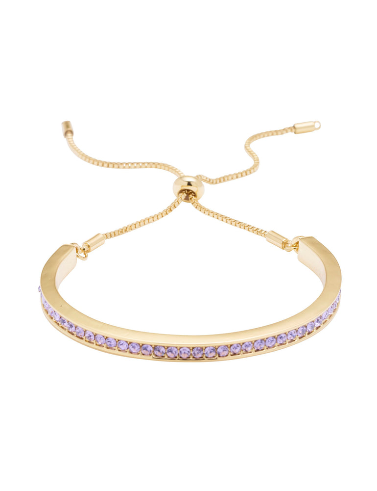 The Stone Channel Bracelet brings perfectly polished style and a gorgeous hint of colour to day or evening looks. This sleek, stylish bracelet features a slim, sleek band in gold-coloured plating, fine sparkling pink stone detailing, and a slider closure for an adjustable fit.