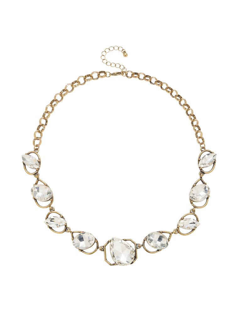 Inspired by old-world glamour, the Antique Necklace is sure to be a stunning centrepiece for day or evening outfits. This beautiful necklace features gold-coloured plating with an antique finish, and faceted, offset stones for eye-catching sparkle, balancing timeless design with contemporary elegance.