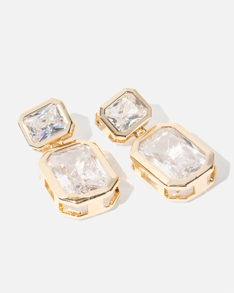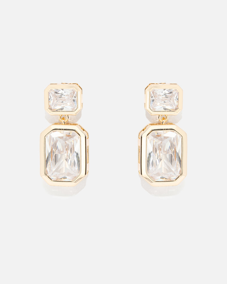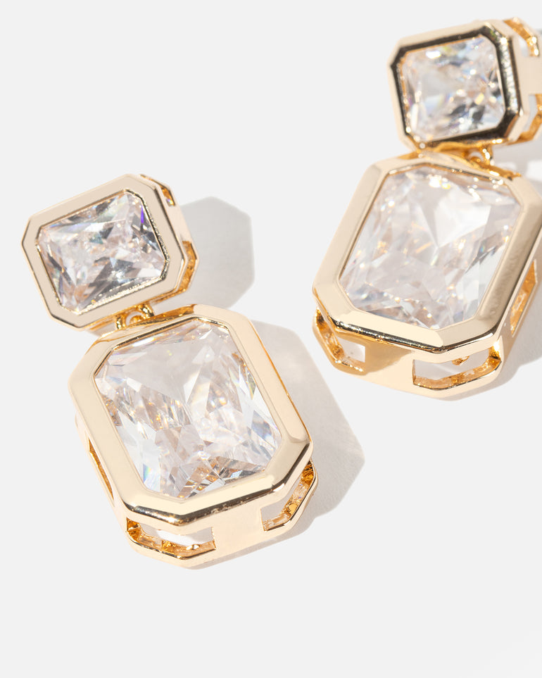 Refined and elegant, the Gatsby Crystal Drop Earrings will add luxurious sparkle to any outfit. Featuring faceted rectangular glass stones in a refined bezel casting, these earrings are eye-catching yet classic.