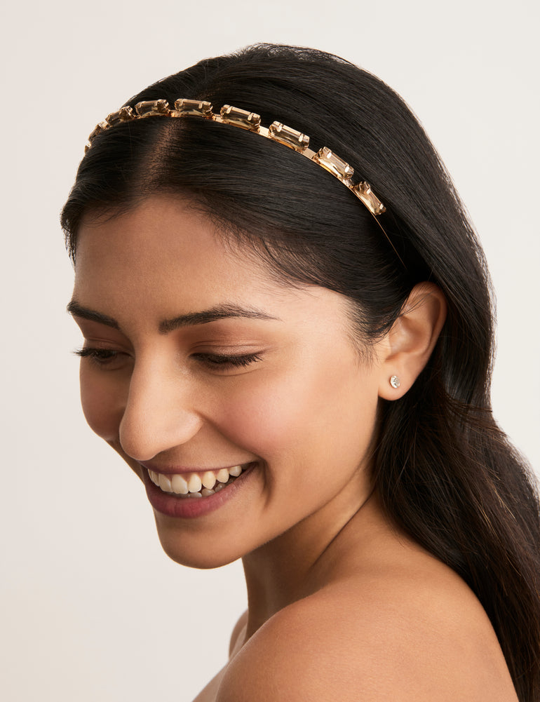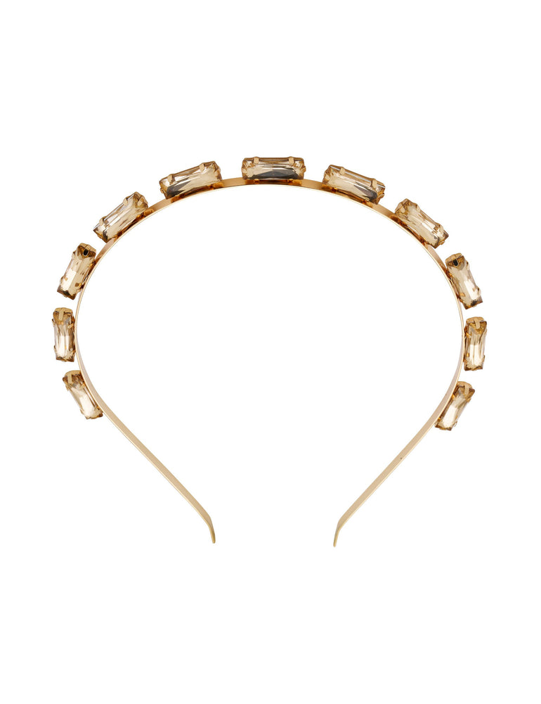 The stunning Ollie Solid Gem Set Metal Headband from Amelie is sure to be the crowning touch to complete your look. This slim gold-coloured band features an array of faceted topaz-toned stones, perfect for bringing sparkle and colour to day or evening looks. Wear it to dress up your everyday style, or to complete your look for parties, weddings, and other special events.