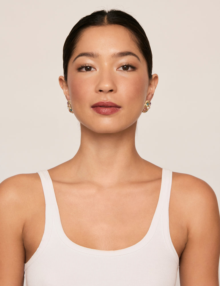 Dress up day or evening looks with the Pebble Gem Stud Earrings from Amelie. These gorgeous stud earrings feature textured gold-coloured plating with mixed, multi-coloured stones and glossy faux pearls. They’re perfect for bringing eye-catching style and sparkle to all your favourite outfits.