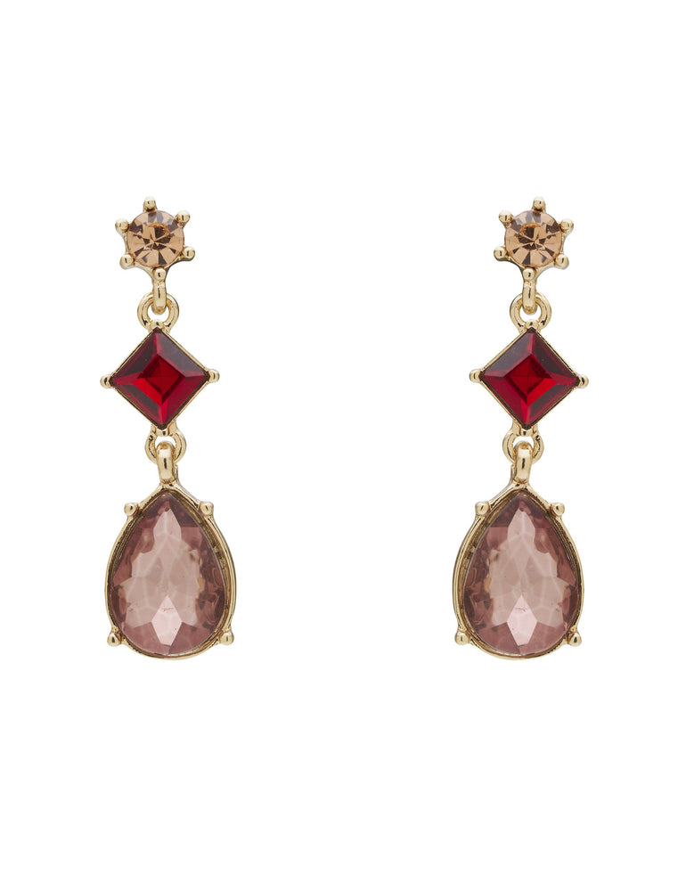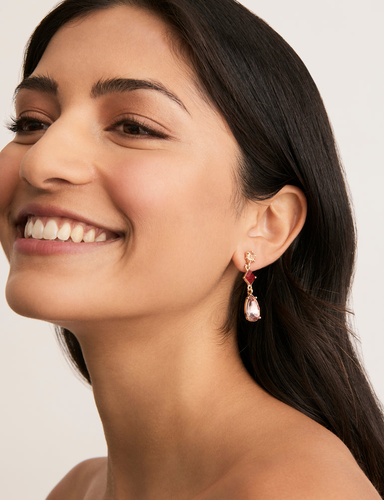 In beautiful shades of pink, the Shape Group Earrings capture contemporary elegance to elevate every outfit. These stunning earrings feature fine faceted stone studs, faceted square drops in deep pink, and faceted teardrops in gorgeous pale pink, perfect for giving day or evening looks a bold splash of colour.