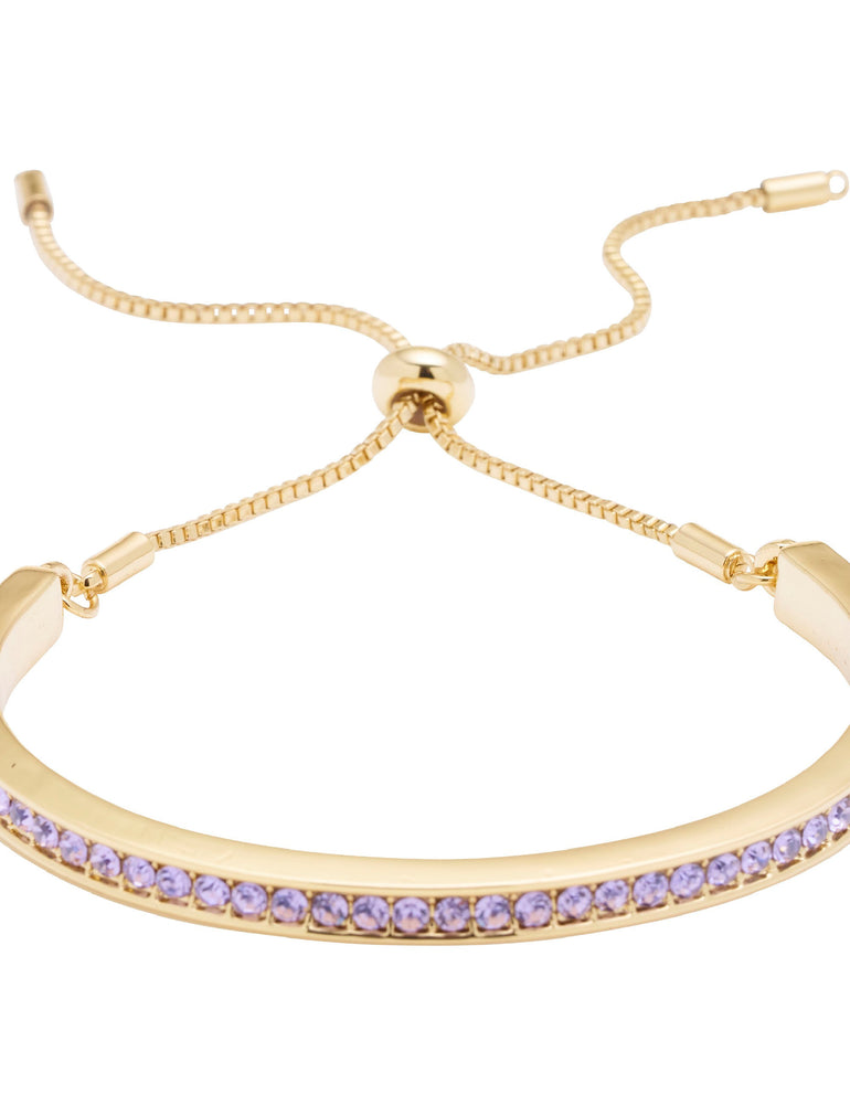 The Stone Channel Bracelet brings perfectly polished style and a gorgeous hint of colour to day or evening looks. This sleek, stylish bracelet features a slim, sleek band in gold-coloured plating, fine sparkling pink stone detailing, and a slider closure for an adjustable fit.